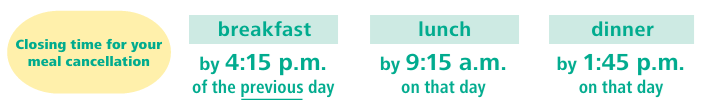 Please inform your doctor or nurse about your meal cancelation by the closing time.
