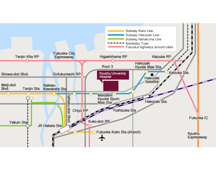 5-min walk from ‘Kyudai Byoin’ ( (1)(10) ) or ‘Keisatsu Honbu Mae/Kyudai Byoin Iriguchi’