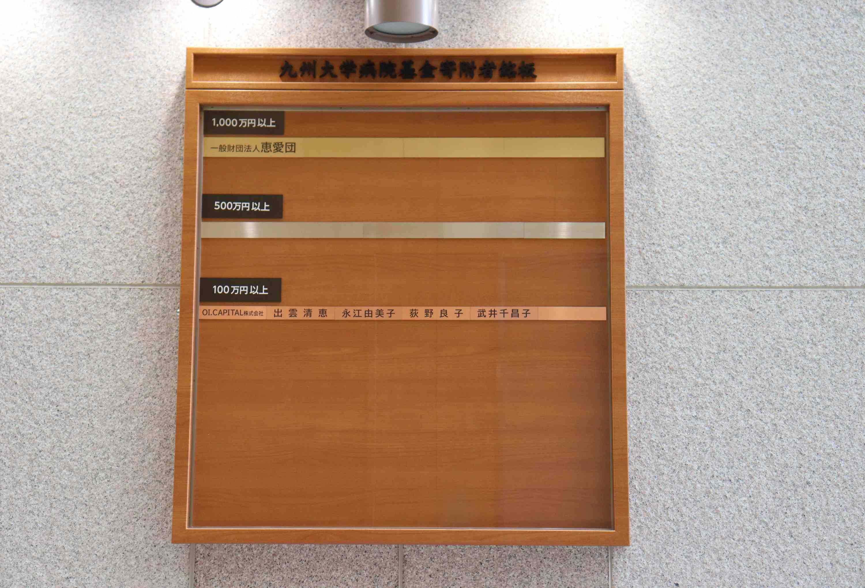 We have installed a “Kyushu University Hospital Fund Donor Nameplate” on the first floor of the Outpatient Clinic Building to express our gratitude to those who have donated to the Kyushu University Hospital Fund.