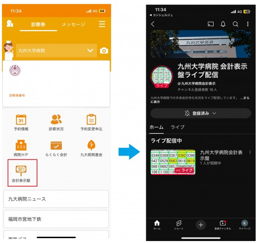 会計表示盤の番号表示状況は九州大学病院コンシェルジュ(アプリ)でもリアルタイムで確認できます。
