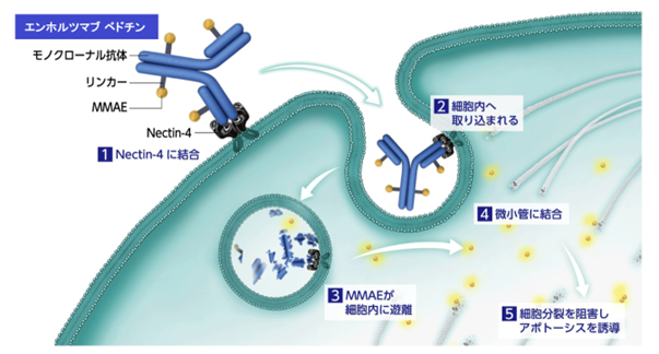 図1 エンホルツマブ ベドチンは、がん細胞の細胞膜上に発現するNectin-4に結合し、細胞内に取り込まれた後にリンカーが切断され、MMAE(Monomethyl auristatin E;抗がん剤)が細胞内に遊離することでがんの増殖を抑制します。