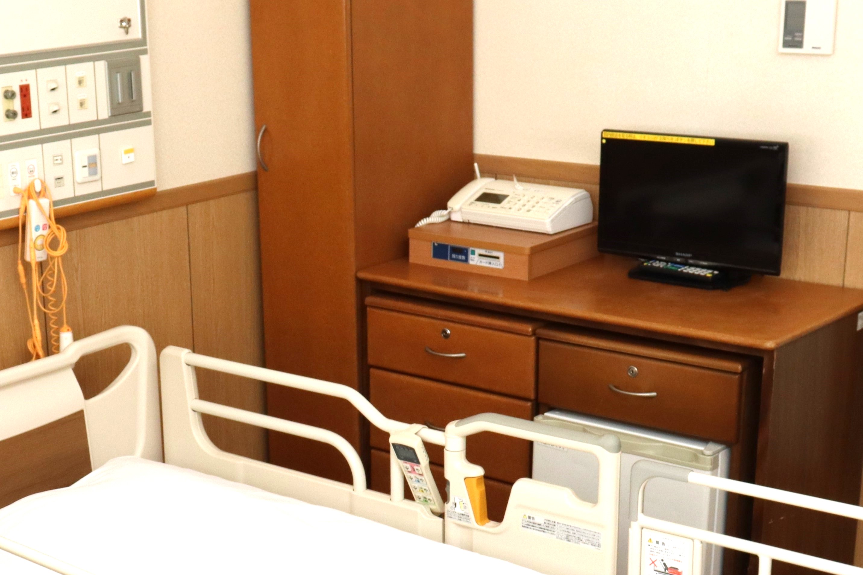 - 病室は、4人部屋が標準です。床頭台、カード式テレビ(有料)、カード式小型冷蔵庫(有料)、オーバーテーブルなどを備えています。テレビを見る時は、イヤホン使用をお願いします(各自でご持参ください。ローソン・売店でも購入できます。個室(S・A・B・C)の場合は不要です)。消灯の21:00以降は、テレビを見ることはできません。同室者へのご配慮をお願いします。